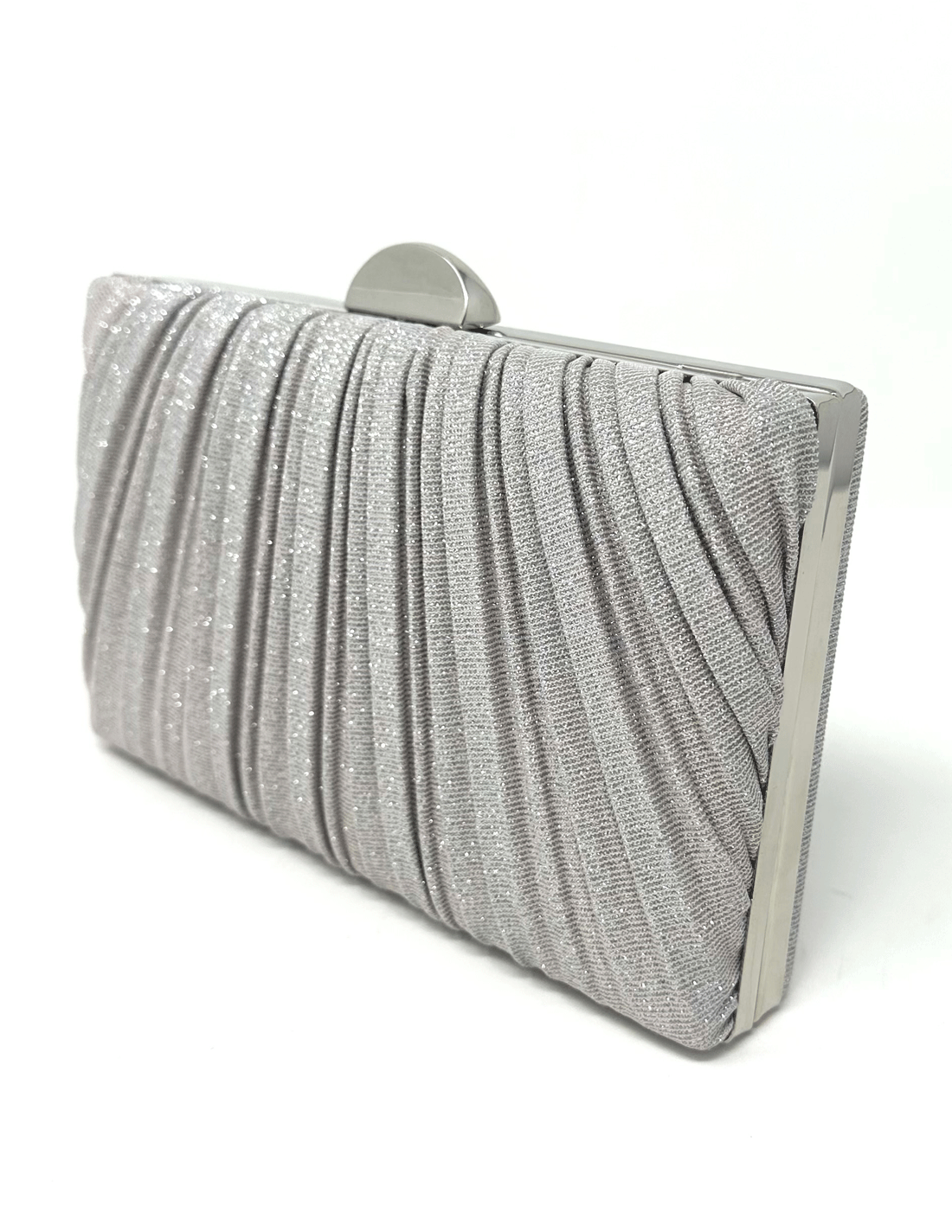 Pleated glitter bag with silver interior handle.